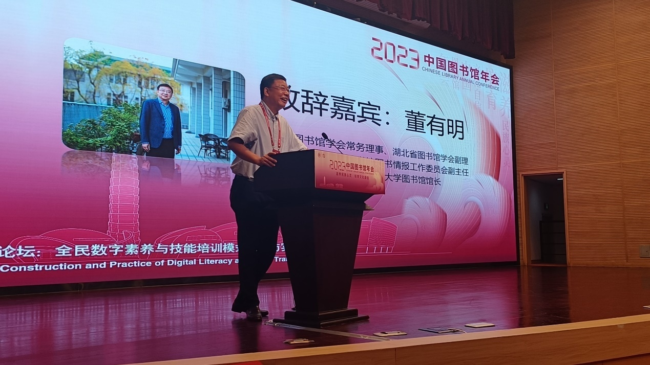 在开幕环节,董有明馆长致辞,他代表主办方对在座的各位嘉宾的到来表示热烈的欢迎。他指出,国家高度重视全民数字素养和技能提升工作,对于图书馆来说是一个重要的契机,应该以《提升全民数字素养与技能行动纲要》(以下简称《行动纲要》为指导来强化教育职能,扩大社会影响,实现高质量发展。图书馆作为提升全民信息素养的关键实施者,应该在这方面有新的作为和新的担当。武汉大学图书馆积极响应国家《行动纲要》的要求,率先在全国高校图书馆成立数字素养教育中心;黄如花教授领衔的国家级全民素质素养和技能培训基地获批,武汉大学图书馆还举办了湖北省的全民数字素养和技能提升的活动以及高峰论坛。期待着学界和图书馆界,特别是理论研究者和实践者共同探讨达成共识,形成一系列推进工作的实践成果和理论成果。