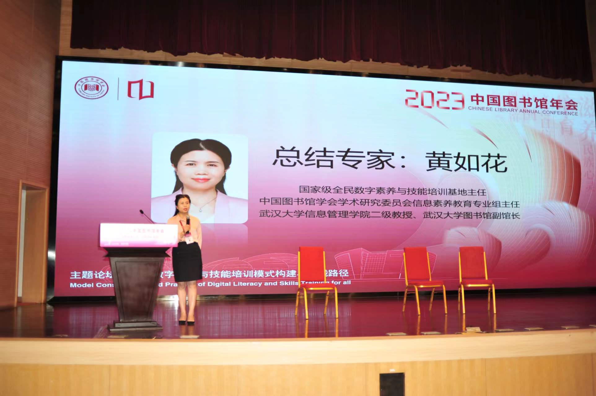 最后,黄如花教授从“多”、“新”、“高”三个方面对大会作总结发言:“多”在论坛报告内容多、参与人数众多、来源层次多、听众收获多;“新”在论坛主题新、报告思路新、作为新、方法新、探索新;“高”在直接面向国家战略定位高,主持人、报告人、案例分享者水平高,听众热情高。同时,她指出,中央网络安全和信息化委员会印发《提升全民数字素养与技能行动纲要》,为图书馆强化教育职能、扩大社会影响、实现高质量发展提供了千载难逢的机遇,呼吁图书馆要紧抓契机努力推动全民数字素养与技能水平的提升。