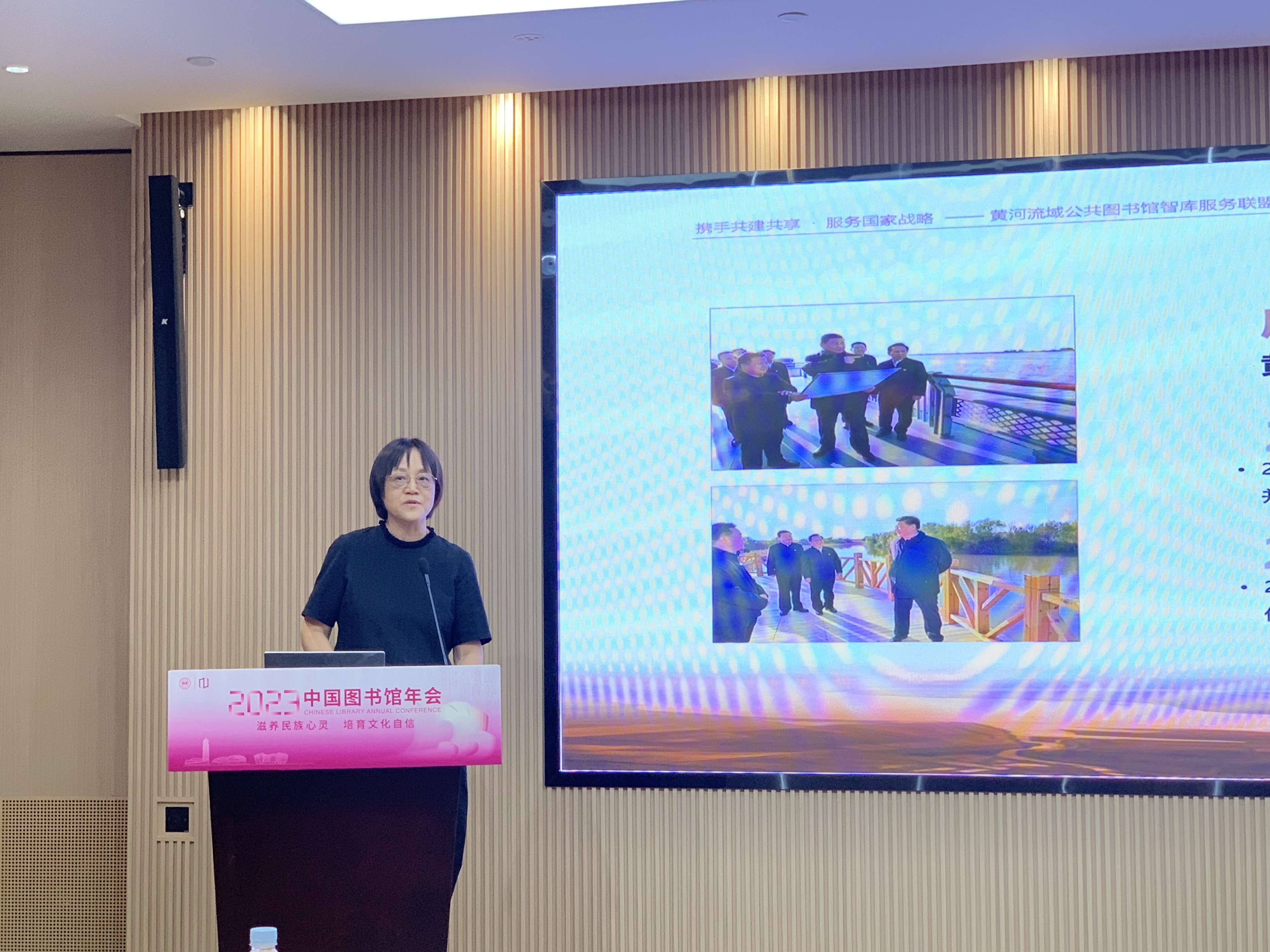 山东省图书馆参考咨询部主任于青作了题为“携手共建共享,服务国家战略——黄河智库服务联盟建设”的发言。积极贯彻落实黄河流域生态保护和高质量发展国家战略既是一项重大政治责任,也是一个重大发展机遇。于青在发言中介绍了黄河流域公共图书馆智库服务联盟的成立背景、基础、联盟发展规划,9大成员馆在资源、成果、人才等方面通力合作,提供文献信息咨询服务等内容,并指出主动服务黄河重大国家战略,是推动立法和决策服务智库化转型的重要实践经验,为立法和决策服务的创新发展提供了新的思路。