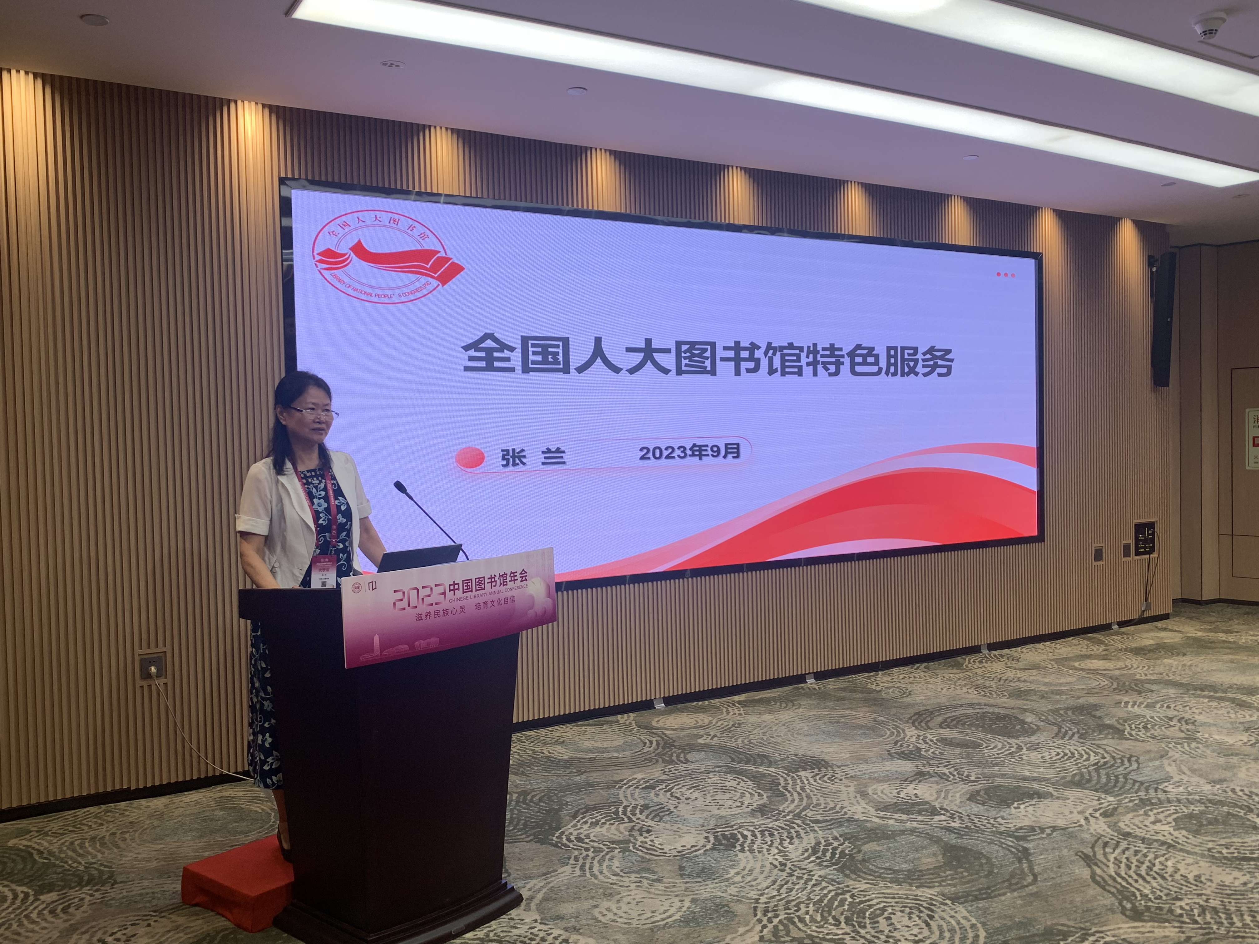 全国人大图书馆原馆长张兰作了题为“全国人大图书馆特色服务”的发言。图书馆特色服务是新时期图书馆公共服务功能之一,是顺应新时代、新形势、新任务的产物。张兰的发言以特色服务的信息需求为切入点,提出特色服务应深刻把握馆藏资源整合、信息需求沟通、交流合作、专业队伍建设等四方面的问题。全国人大图书馆深入思考人大工作的切实需要,将服务立法与服务人大日常工作相结合,打造了一系列具有人大特色的精品服务。这些服务是图书馆深入立法最前沿阵地、积极发挥决策参谋助手作用的最鲜活案例,为各地方图书馆积极开展两会服务、人大代表服务等提供了有益借鉴。