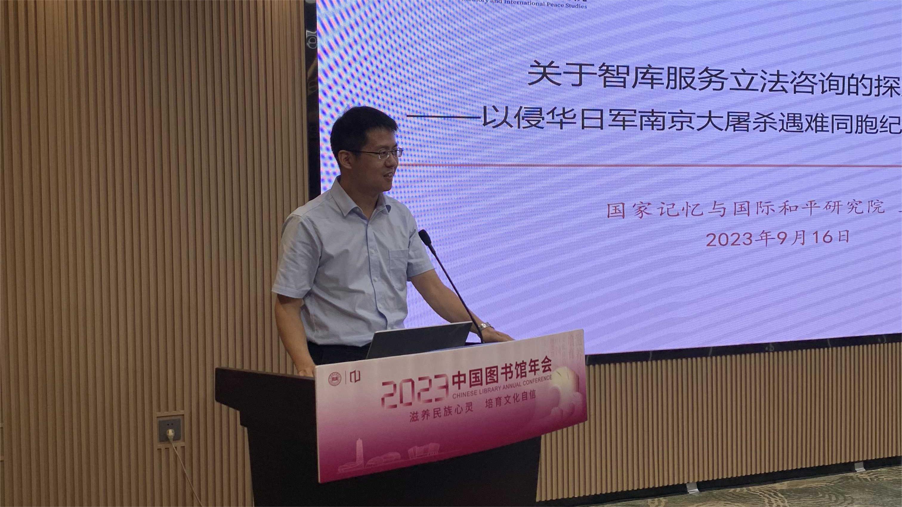 侵华日军南京大屠杀遇难同胞纪念馆研究部智库办负责人王立作了题为“关于智库服务立法咨询的探索和思考——以侵华日军南京大屠杀遇难同胞纪念馆智库建设为例”的发言。侵华日军南京大屠杀遇难同胞纪念馆主办的新型智库“国家记忆与国际和平研究院”,是江苏省首批重点高端智库。王立在发言中介绍了为国歌立法建言献策、《南京市国家公祭保障条例》立法调研和起草两个立法咨询案例。重点以研究院开展的《南京市国家公祭保障条例》立法调研为例,从立法调研促进智政对接、立法咨询成果转化为法的意志、智库推进立法工作的启示三个方面,讲述了智库服务立法和决策咨询工作的经验与体会。对创新图书馆立法和决策咨询服务、推动智库咨政建言、推进社会主义法治国家建设提供了有益的实践参考。